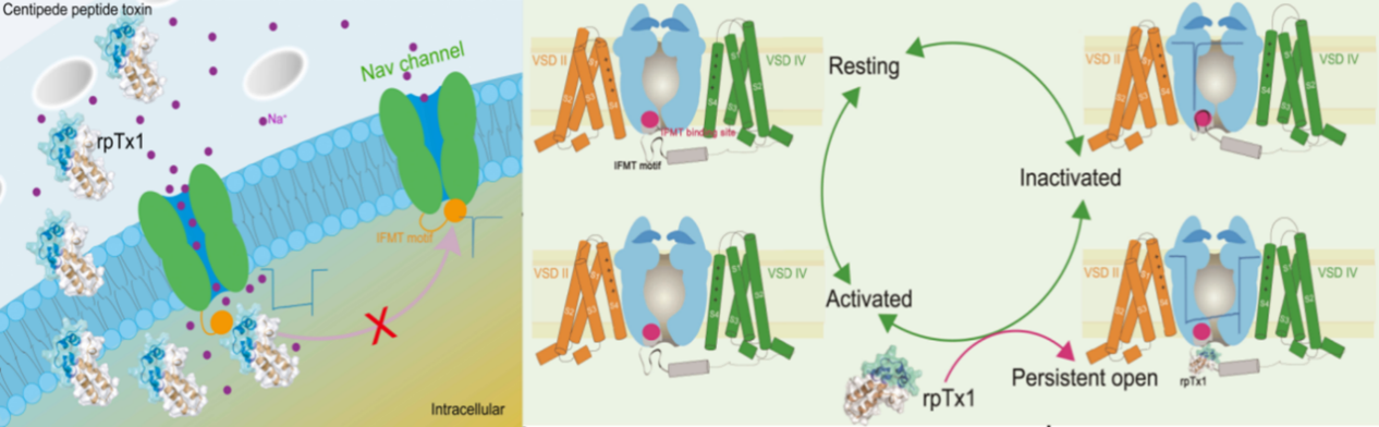 研究团队从红头蜈蚣毒液中首次鉴定出一种具有双结构域和双功能特性的新型多肽毒素rpTx1,一个结构域行使穿膜入胞的功能,另一个结构域直接与钠通道胞内失活球区域结合而抑制通道快失活。该研究取得三个重要发现:一是发现了一种多肽毒素调控钠通道的新模式,即通过作用钠通道胞内区域调控钠通道功能,打破多肽毒素仅能在胞外调控钠通道功能的传统观点。二是发现了钠通道上一个新的神经毒素结合位点。三是揭示了钠通道亚型Nav1.8具有较慢快失活特征这一关键科学问题的新机制,证实其失活球与受体位点的低亲和力结合是该现象的关键决定因素。该研究揭示了蜈蚣多肽毒素独特的结构与功能多样性,开启了多肽毒素胞内调控离子通道功能的新研究方向,深化钠通道结构与功能研究及药物研发,并将推动离子通道领域一个过去较少触及的研究方向——胞内结构域调控离子通道功能的作用和机制。