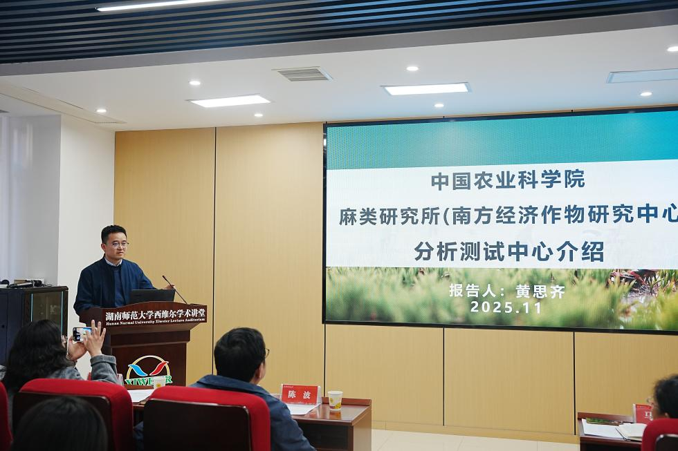 黄思齐高级实验师首先通过一段视频,生动展示了麻类研究所的发展历程与研究特色。他强调,研究所始终秉持“把论文写在祖国大地上”的理念,注重科研成果落地转化。随后,他详细介绍了麻类分析检测中心的技术能力、检测成果及科研转化案例,并提出了具体的合作构想,希望与高校携手推动麻类产业的创新应用。